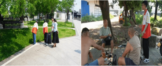 成员们清理河道沿岸垃圾 成员们向居民们宣传环保