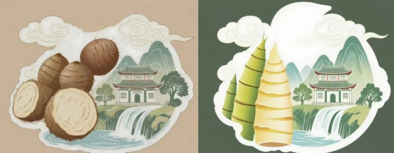 一村一品特色农产品IP(左图“槟榔香芋”,右图“麻竹笋”)