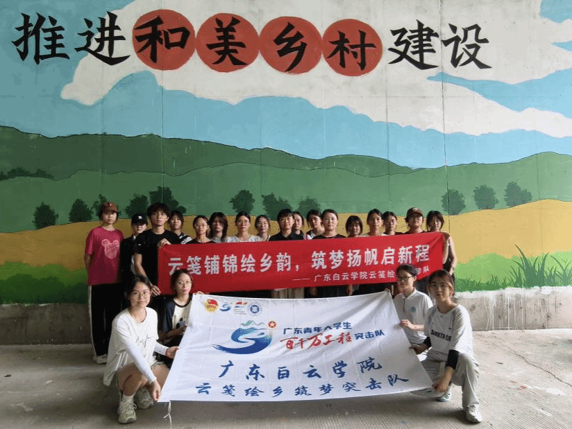 7月7日至11日,广东白云学院云笺绘乡筑梦突击队走进广州市江高镇郭塘村,开展为期五天的"墙绘赋能乡村振兴"主题实践活动。17名白云学子充分发挥专业特长,以艺术之笔描绘乡村振兴新貌,将31米长、4.9米高的水泥拱壁,绘就成一条“会讲故事”的彩虹长廊,为郭塘村增添了一道靓丽的文化风景线。