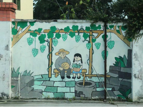 “每一面墙都是一个故事载体,每一笔色彩都是一次文化传播。”在创作“人心向聚暖”板块时,队员吴静雯特意加入了村民围坐分享丰收果实、村委干部讲解政策的场景,“这是我们调研时看到的真实画面,希望通过画笔让更多人感受到井塘村‘党群同心’的凝聚力。”而“岁月皆安恬”中老人树下摇扇的悠闲、“庭院四季美”里春有花、秋有果的景致,则用细腻的笔触勾勒出乡村生活的平和与美好,让观者瞬间get到“此心安处是吾乡”的归属感。