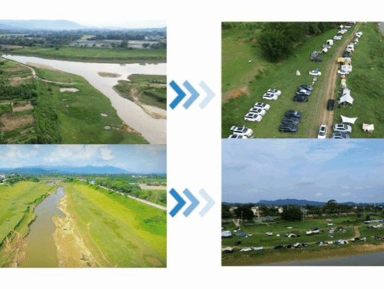 沿着蜿蜒河道前行,队员们发现耀潭村独特的东江冲积河滩地貌——河道两侧平坦开阔,丘陵与平原交织,构成别具一格的自然风光。经过规划打造,这片河滩上的草坪变身热门露营地,游客在此搭建帐篷、亲近自然,成为乡村文旅融合发展的生动注脚。