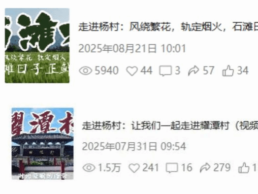 云影逐光突击队在杨村镇开展了为期七天的深度实践,通过系统走访和细致调研,深入挖掘并理解了当地丰富的文化资源与发展历程。团队聚焦耀潭村与石滩村,精心创作出2部主题宣传视频和1篇深度新闻报道。截至8月29日,发布在“福喜杨村”视频号平台的两部视频反响显著,播放量分别达到5940次和1.5万次,有效传播了杨村的振兴故事与乡村新貌。